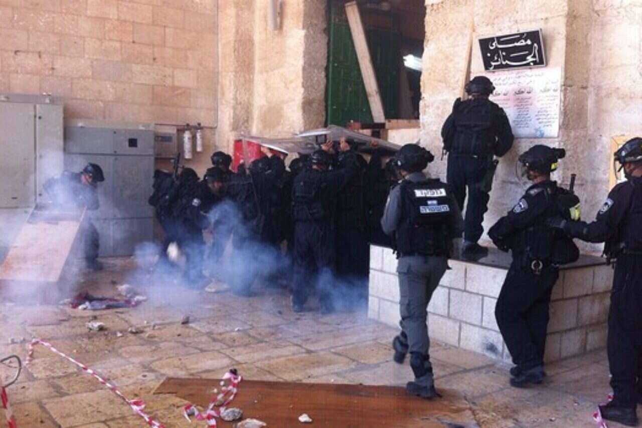 עם פתיחת הר הבית לביקורים, החלו כמה עשרות צעירים רעולי פנים ליידות אבנים ולירות זיקוקים בכינון ישיר לעבר כוחות המשטרה בשער המוגרבים. כוח משטרה נכנס לשטח הר הבית והדף את המתפרעים לתוך מסגד אל אקצא. המתפרעים הציבו מבעוד מועד חסימות ברחבת אל אקצא ושפכו חומר דליק בסמוך אליהם וכן הציבו מחסומים בשער הכניסה האחרון למסגד, המתפרעים החלו ליידות אבנים ובלוקים לעבר השוטרים מתוך מסגד אל אקצא, ירו זיקוקים בכינון ישיר התיזו לעבר השוטרים נוזל שאינו מזוהה בשלב זה וגורם לצריבת נשימה ואף השליכו בקבוק תבערה שפגע במגיני השוטרים, התנפץ אך לא התלקח.