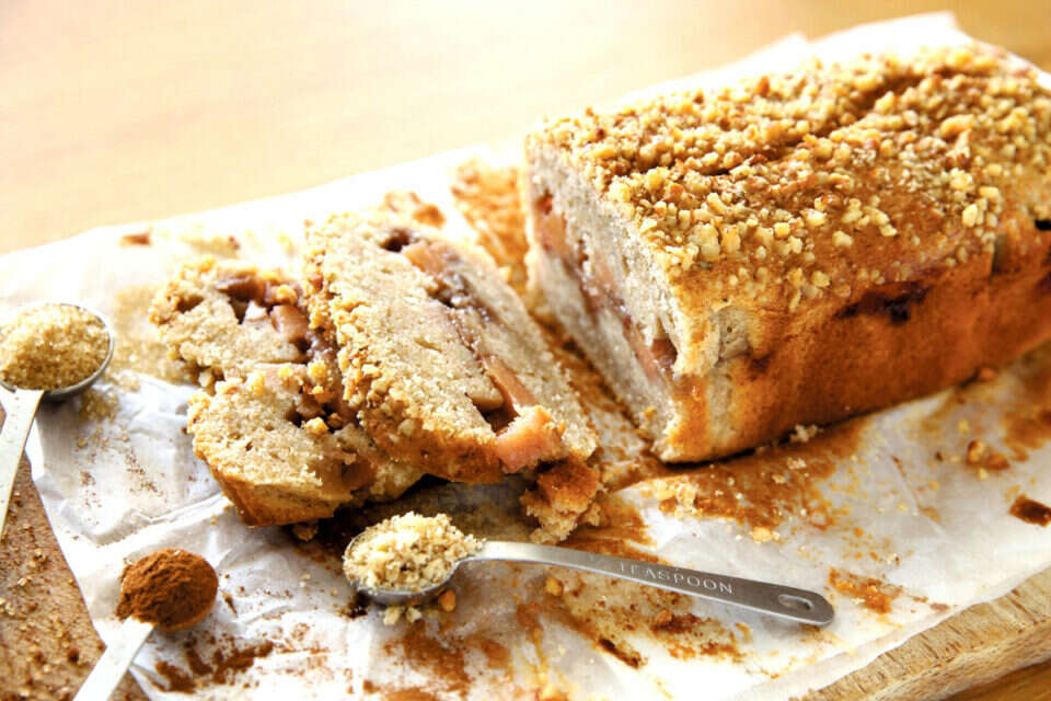 • יוצקים לתבניות, שווה בשווה, מחצית מכמות הבלילה. מפזרים על פני הבלילה מריבת החבושים וקינמון. מכסים בשארית הבלילה ומקשטים באגוזים גרוסים.
