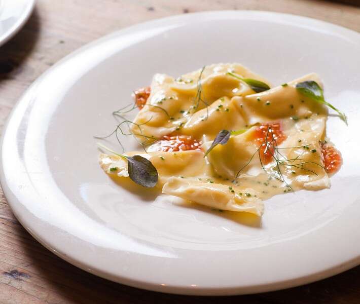 קרם פולנטה ומסקרפונה הם שממלאים את הרביולי ואת הפה במתיקות עדינה, כזו שמודגשת בזכות חמצמצות הרוטב. המילוי מבוסס בעיקר על תירס טרי. הקמח המופיע במתכון הוא קמח אינסטנט לפולנטה מהסוג המיובא לארץ מאיטליה, כזה שאפשר למצוא גם ברשתות השיווק.