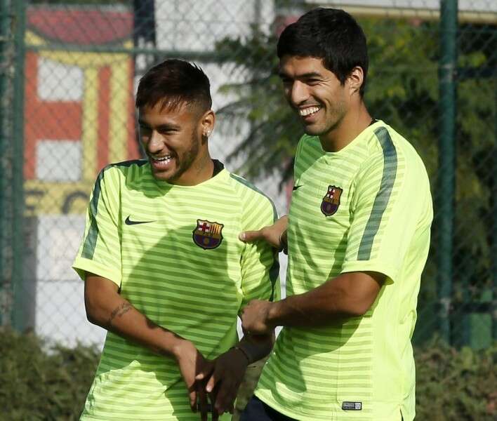 סוארס משתעשע עם ניימאר באימון // צילום: רויטרס