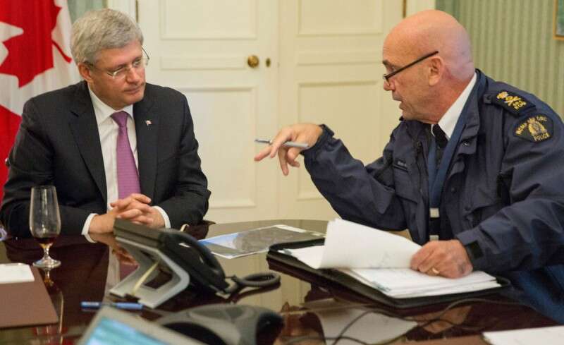 ראש ממשלת קנדה הרפר (משמאל) בזמן תדרוך בעקבות הירי /// צילום: אי.פי