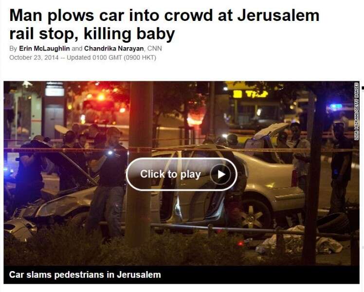 במקביל, ב-CNN הכותרת בכתבה על הפיגוע היא "אדם דהר עם מכוניתו לתוך תחנת רכבת הומת אדם והרג תינוקת". כותרת שמשאירה הרבה "מקום לספק": אולי הוא היה שיכור, אולי הוא בדיוק התעסק עם הסלולארי ואולי לחץ בטעות על הגז במקום על דוושת הבלם. לשיטתם, לא מדובר בפיגוע טרור של מחבל מזוהה עם חמאס, שבעבר ריצה תקופת מאסר בכלא הישראלי – אלא "רק מקרה מצער של הריגה בשוגג".