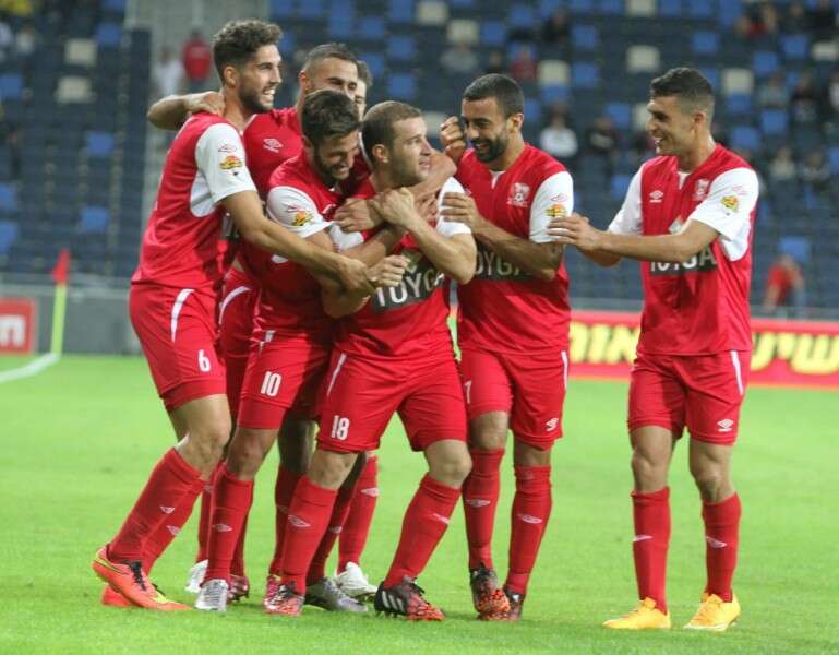 עותמאן זוכה לחיבוק גדול מהחברים לאחר כיבוש השער אמש // צילום: יוסי שקל