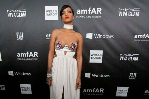 ובאותו אירוע ממש, עם אותו מעצב ממש, שזכה בפרס באירוע שנועד לגייס כספים למלחמה באיידס, גם ריהאנה מפגינה בעיקר עירום. את הפטמות שלה היא מסתירה באמצעות אבני חן. יצירתי, אך פרובוקטיבי. ויודעים מה? מילא היינו מקבלות את כל הבגד החושפני הזה. למה לצרף לו גרביונים כאלה? ומה הקטע של הסנדלים עם המראה המאוד פרחי שאמנם מתאימים לרקמה מכסת השדיים, אבל נראים כמו נעליים של דראג קווין?