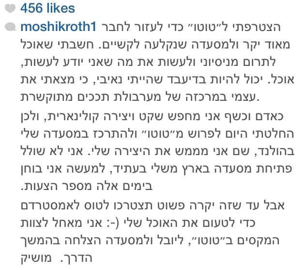 למי שאינו בקיא בסצינה הקולינארית הישראלית, אתמול היה יום שבת סתווי ושגרתי. אלא שאצלנו, השפים, המסעדנים ועיתונאי האוכל – השעה 11:00 בבוקר הייתה מהסוערות שידענו בחודשים האחרונים. מושיק רוט, השף הישראלי המוערך שעושה חיל באמסטרדם, הודיע על פרישתו מניצוח על מטבחה של מסעדת טוטו התל אביבית. זאת לאחר חמישה חודשים מתוקשרים במיוחד.