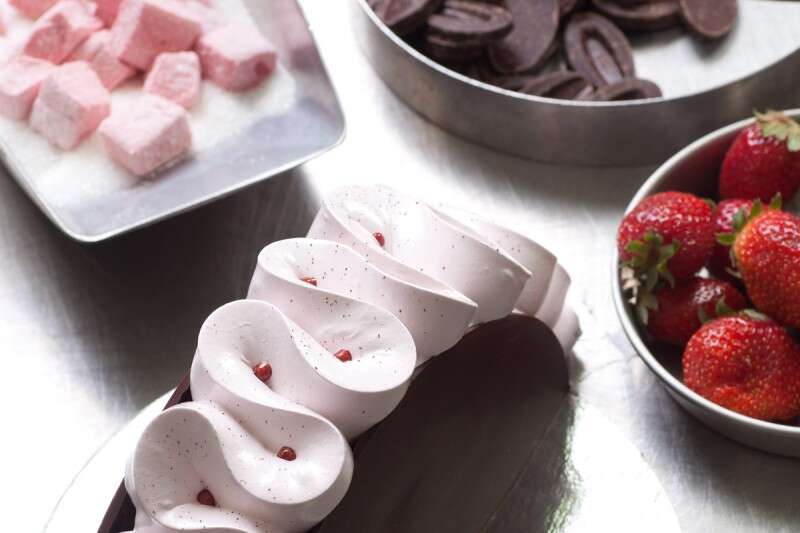 חותכים פתח אלכסוני קטן בקצה שק הזילוף ומזלפים את המרשמלו בצורה של נחש מפותל (ראו תמונה). חוצים את עיגול השוקולד המריר, מניחים בכל צד מחצית ומעטרים בריבת תות שדה על המרשמלו המזולף.