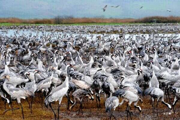 אנחנו מגיעים בשעת בין הערביים והשמיים צבועים בכתום־אדום עז ומקושטים בעננים הנראים כמצוירים במכחול של צייר מוכשר במיוחד. לפתע אלפי עגורים ממלאים את השמיים. הופעתם מלכותית וזקופת צוואר וקולותיהם רמים.