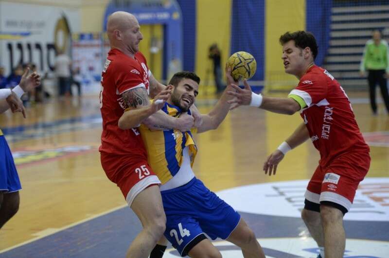 לוזון ופיליפ (באדום), האקסים של מכבי, מנסים לעצור את עמית סטלמן // צילום: עמית שיסל