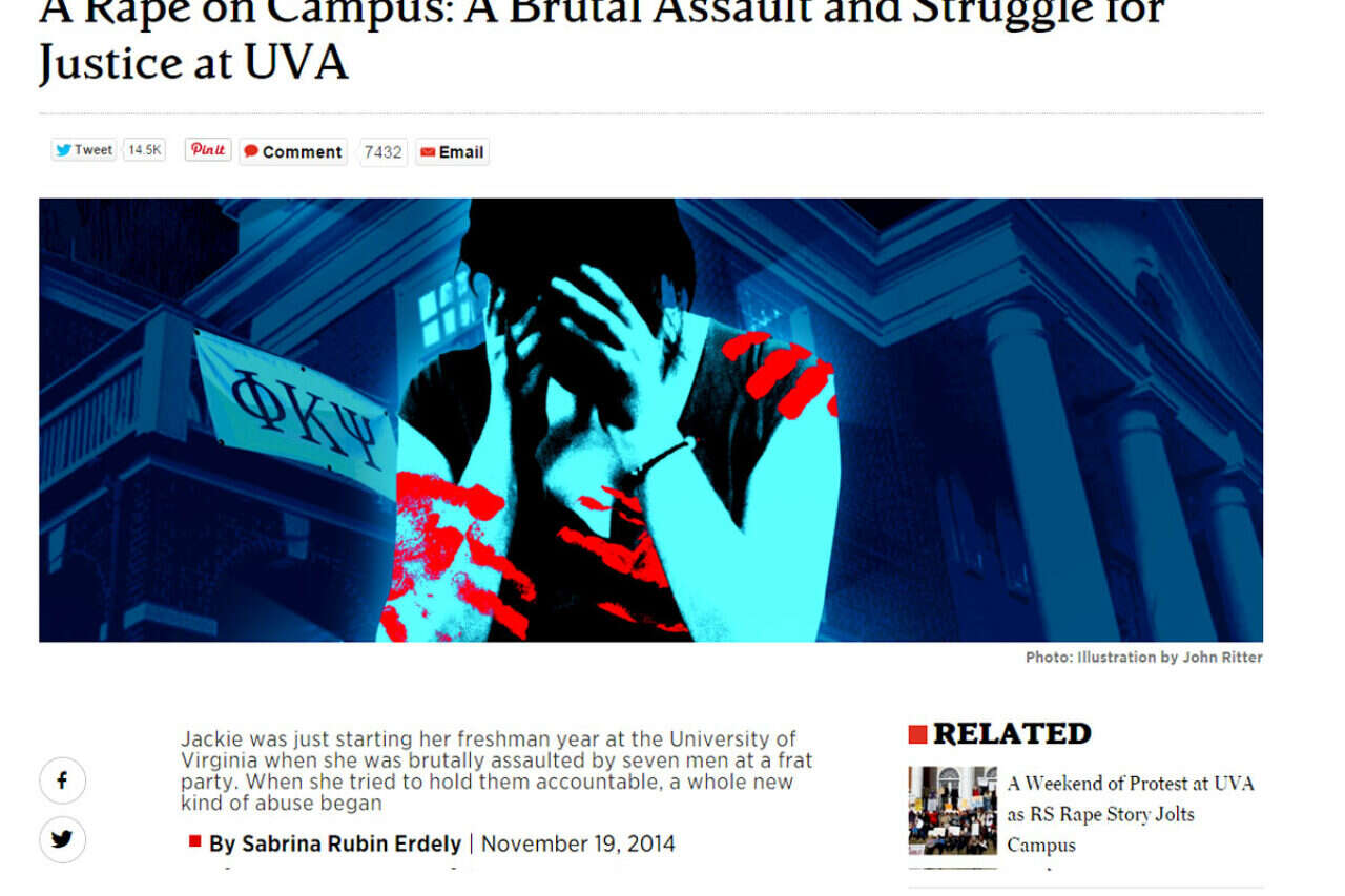 "בהתבסס על מידע חדש נראה כי יש סתירות בגירסה של ג'קי, והגענו למסקנה כי האמון שלנו בה היה לא במקום", כתב העורך הראשי של המגזין, וויל דאנה, והוסיף: "ניסינו להיות רגישים לבושה ולהשפלה הבלתי הוגנות שמהן סובלות נשים רבות לאחר תקיפה מינית, וכעת אנו מצטערים על ההחלטה שלא ליצור קשר עם המבצעים לכאורה של האונס כדי לשמוע את גרסתם". ב־19 בנובמבר פורסם ב"רולינג סטון" סיפורה של ג'קי, סטודנטית אלמונית באונ' וירג'יניה, שטענה כי עברה אונס קבוצתי ב־2012 וסיפרה על מקרים נוספים של אונס באונ', שאינם מדווחים.