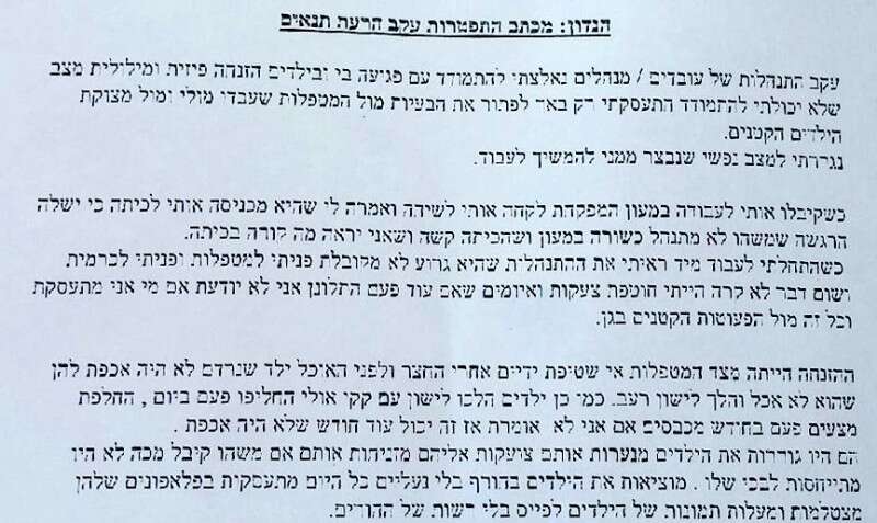 לפני שבוע הוגשה תלונה במשטרה על הזנחה והתעללות נגד אחת ממטפלות הגן, ולאחריה חמש אימהות נוספות הגישו תלונה נגד אותה מטפלת ונגד שתי מטפלות נוספות.