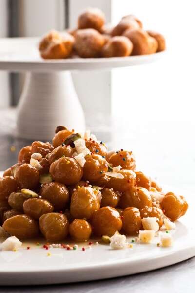 מטגנים בשמן עמוק לכדי הזהבה, מסננים מיתרת השמן ומעבירים לנייר סופג. בסיר אחר מביאים לרתיחה את הדבש ומיץ הלימון, מעבירים אליו את כדורי הבצק ומבשלים על אש בינונית 5 דקות. מסדרים במערום על צלחת ומקשטים בקליפות הדרים וסוכריות צבעוניות.