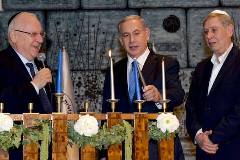 פרדו (מימין), נתניהו וריבלין, מדליקים נרות בטקס // צילום: חיים צח, לע"מ // פרדו (מימין), נתניהו וריבלין, מדליקים נרות בטקס