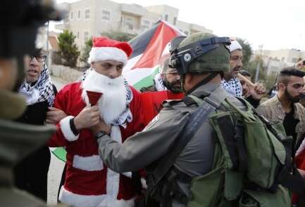 Dozens of Palestinian protesters, some of them festively dressed as Santa Claus, clashed on Tuesday with Israeli security forces in Bethlehem, a day before the beginning of Christmas celebrations in the West Bank city revered as the birthplace of Jesus. The demonstrators gathered at the Bethlehem checkpoint to protest against "an occupation that controls our lives, and surrounding us with the apartheid wall," a press release by the Popular Struggle Coordination Committee said. Israel started building the security fence in 2002 in response to a wave of Palestinian suicide bombings. It says the barrier has kept its citizens safe from terrorists. Around 50,000 Palestinian Christians, including 17,000 Catholics, live among 4 million Muslims in the West Bank and Gaza. They claim Israel's checkpoints and security barrier cut them off from their neighbors and holy places in Jerusalem. The issue of Palestinian movement restrictions comes to the fore every year in the run-up to Christmas, when tens of thousands of religious tourists make their way to Bethlehem, other parts of the West Bank and Jerusalem to celebrate the birth, life and death of Jesus. When it comes to Bethlehem, a city of 25,000 just 8 kilometers (5 miles) south of Jerusalem, the critical issue is getting foreign tourists past Israeli checkpoints and convincing them to stay the night. Many now choose to stay in Jerusalem and make a day trip. Palestinian officials claim the growth of Israeli settlements -- there are now 22 around Bethlehem -- is steadily strangling access, prompting tourists to stay away. On the morning of Christmas Eve, Latin Patriarch Fouad Twal will leave Jerusalem in the head of a festive motorcade toward Bethlehem, where he will lead Christmas Eve mass in the Church of Nativity.