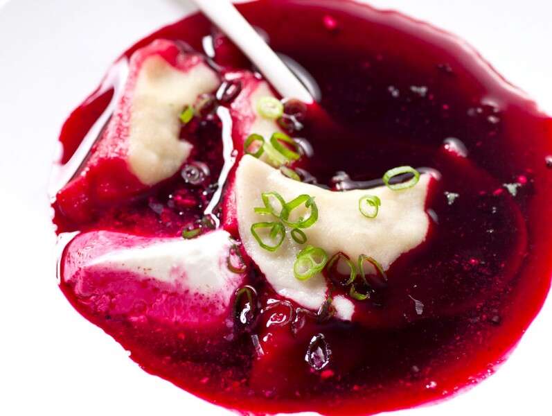 קרעפלך כוסמת וגבינה במיץ סלק. השראה פולנית // צילום: איתיאל ציון