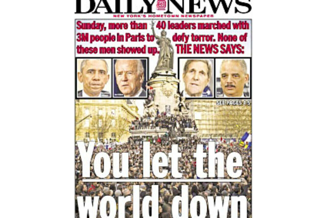 בשעה ש־40 מנהיגים מכל העולם הגיעו לבירת צרפת לרגל האירוע, את ארה"ב ייצג בעצרת השגריר בצרפת, בשעה ששר המשפטים האמריקני אריק הולדר שהה בפאריס. ארנסט הסביר כי סידורי האבטחה המורכבים מנעו מאובאמה ומסגנו ביידן לטוס לצרפת בהתראה קצרה. "הניו יורק דיילי ניוז" פירסם כותרת המכוונת לאובאמה ולבכירי ממשלו: "אכזבתם את העולם".