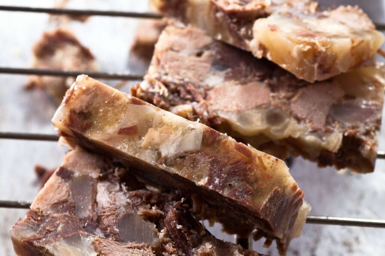 מסננים את הנוזלים במסננת דקה מאוד ושומרים. קולפים את הלשון ומנקים את בשר הרגליים מעצמות. את הסחוס שומרים. קוצצים את מיני הבשרים ואת הסחוסים קציצה גסה - נתחים בגודל ס"מ וחצי או שניים. מכניסים לתבנית טרין ויוצקים מעל את הנוזל המסונן. מניחים בחוץ לשעה ומעבירים למקרר למשך 12 שעות.