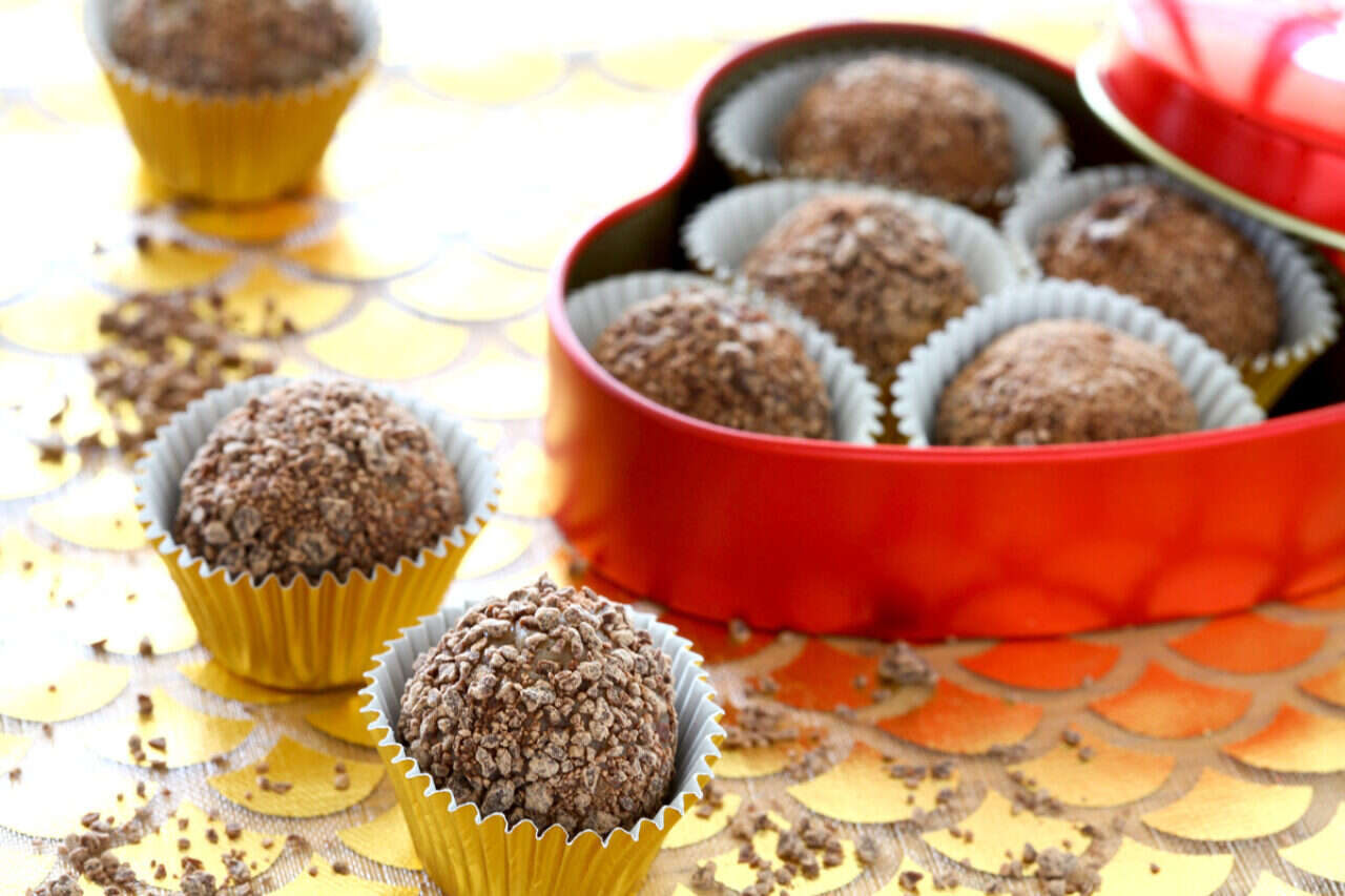 1. טוחנים את כל המרכיבים לממרח אחיד. מגלגלים לכדורים, מצפים בשוקולד מגורר ושומרים במקרר עד להגשה.