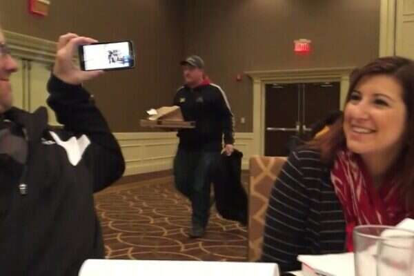 רוב, שליח הפיצה, היה מופתע לחלוטין - במיוחד כשהוזמן על ידי מנחה הערב לקדמת האולם על מנת לקבל את המתנות שבחרו להעניק לו ולשאת דברים.