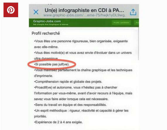 סטודיו חשוב לעיצוב בפריז שמחפש לגייס מעצב חדש לשורותיו, פרסם באתר מוכר מודעה בה ציין כי הוא מחפש עובד קפדני, מאורגן, בעל מוטיבציה גבוהה אך "אם אפשר, לא יהודי". המודעה, שעוררה סערה רבה, הורדה כעבור 35 דקות, אך מישהו הספיק לצלם את המודעה לפני שנמחקה.