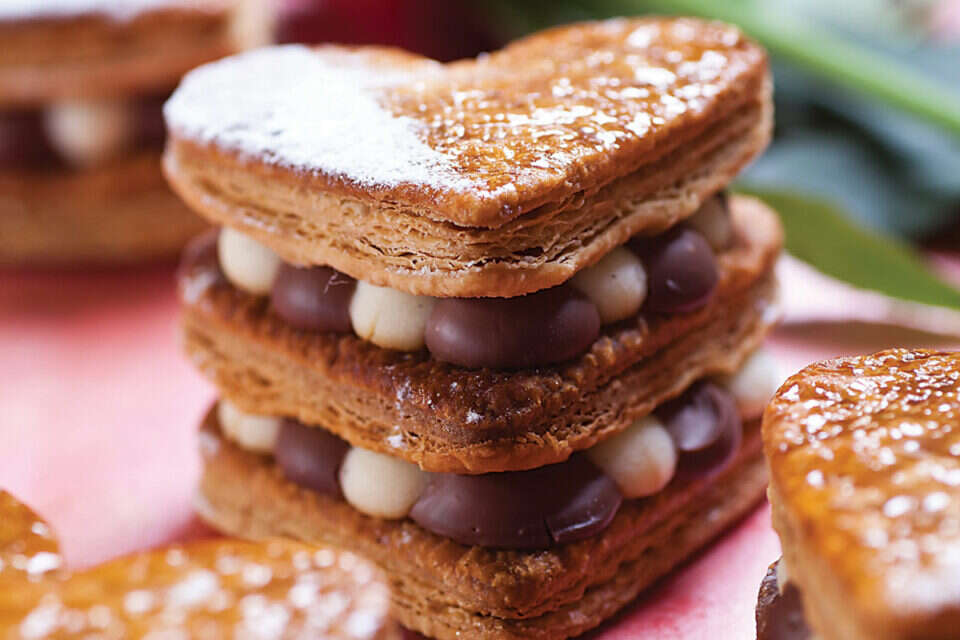 מתכון מקסים שמשלב שכבות בצק וקרם. נקרא גם קרם שניט או עוגת נפוליאון. תבנית בצורת לב הופכת אותו לרומנטי במיוחד.