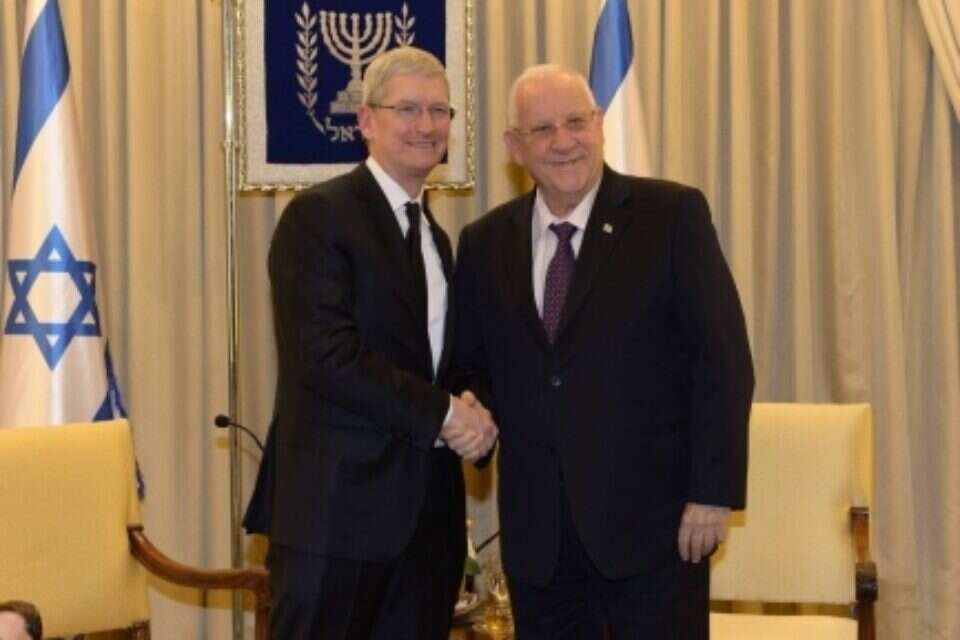 President Reuven Rivlin welcomed Apple CEO Tim Cook to the President's Residence on Wednesday. Cook is visiting Israel as head of an Apple delegation ahead of the inauguration of the company's new local office in Herzliya. At the start of the meeting, Rivlin shook Cook's hand and said, "It is a great privilege to host you and your team here in Israel." "Your contribution to humanity is unprecedented. Even for me as one who prefers to write with a pen and paper, it is clear to me, when I see through my staff, and my grandchildren, what a great miracle you have created." Cook thanked the president and said, "We have an enormous admiration for Israel, not just as an important ally for the US, but as a place to do business." Rivlin congratulated Cook on Apple's new operations center in Herzliya, expressing his hope that it would employ people from a broad spectrum of Israeli society. "True innovation can only result from full access to education for all, regardless of race, religion, or sex. We would like to learn from your experience in the US, in bringing education and technology to periphery groups and communities." Rivlin said. Cook was accompanied by Apple's vice president of hardware technologies, Johny Srouji, an Israeli Arab from Haifa. Rivlin stressed how proud he was that Srouji was part of the delegation, saying, "Imagine what the world would be like with another five 'Johny Sroujis.' We are proud of him, and all he has achieved." Cook backed up the president's words, saying that the diversity of Apple's workforce was one of the reasons the company had achieved so much. Cook also met on Wednesday with former President Shimon Peres. Cook requested the meeting to discuss cooperation and ways that Apple as a global company could foster connections between people from different regions while promoting peace and tolerance through technology. At the start of the meeting, Peres told Cook: "I'm happy that you decided to open an Apple headquarters in Israel. There is no doubt that your company's leading technology and creativity fit in with the Israeli spirit." Cook told Peres that Israel and the creative Israeli mind were of enormous value to Apple, and that he was very proud to be opening the Herzliya offices.