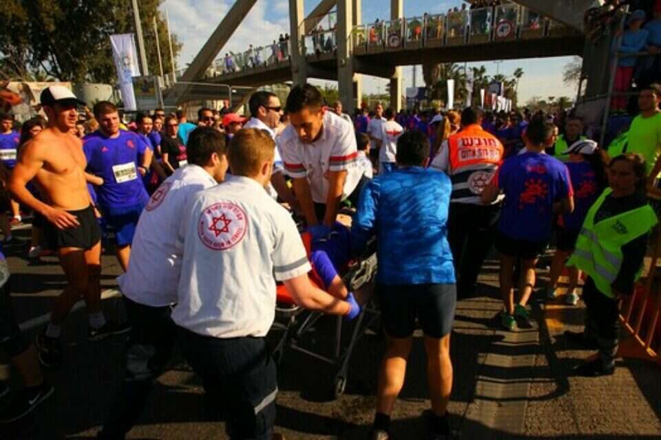 שני גברים כבני 30 שהשתתפו בריצה במרתון תל אביב, פונו ממסלול המירוץ במצב קשה. אחד הרצים איבד את ההכרה, ונזקק להחייאה, חובשי מד"א שהיו במקום פינו אותו במצב קשה מאוד לביה"ח איכילוב. מעט מאוחר יותר התמוטט אדם נוסף, שסבל ככל הנראה ממכת חום ופונה לביה"ח כשהוא מורדם ומונשם. בסיום המירוץ אותר אדם נוסף כשהכרתו מעורפלת, והוא פונה במצב קשה לביה"ח בילינסון.