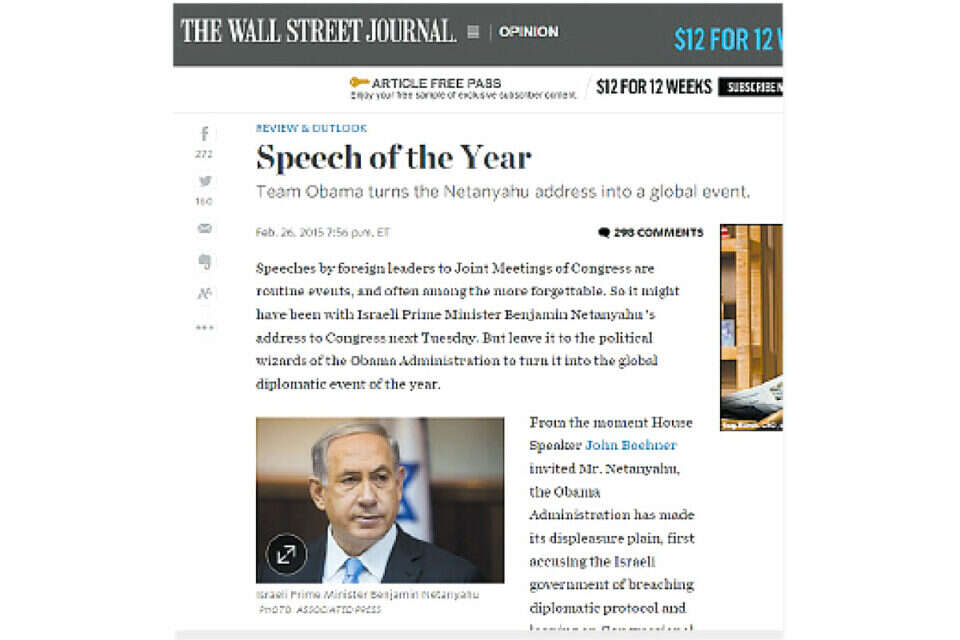 "נאום השנה" - זו הכותרת שבחר בסוף השבוע ה"וול סטריט ג'ורנל" למאמר מערכת על נאומו הצפוי של ראש הממשלה בנימין נתניהו בקונגרס ב־3 במארס.