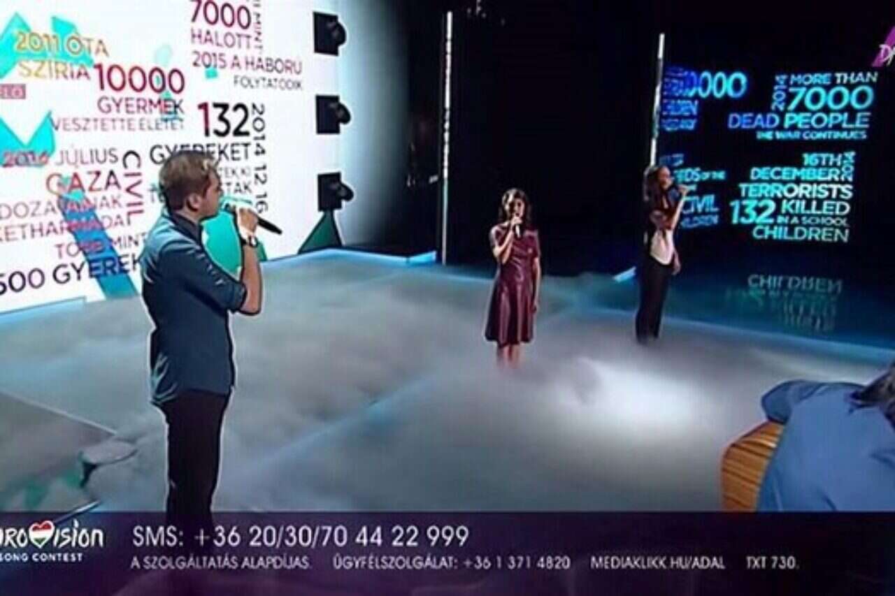 "שני שלישים מהקורבנות בעזה הם אזרחים ויותר מ־500 ילדים" (civil Gaza az aldozatnak ketharmada tobb mint 500 gyerek), נכתב על המסך. בהמשך נכתב גם על הקרבות בסוריה, שם צוין כי נהרגו 10,000 בלבד - נתון רחוק בהחלט מהמציאות. לזמרת ההונגרייה שנבחרה קוראים בוגי, ממש כמו לשר הביטחון שלנו, שזה קיצור של "Boglárka Csemer", והשיר שלה, יש להניח, יעורר הרבה מחלוקות בתחרות שתיערך במאי הקרוב.