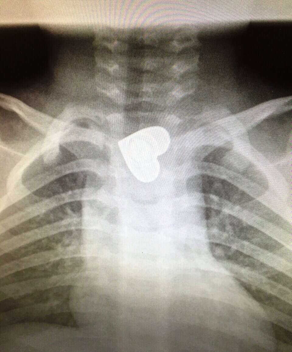 הילד נשלח לצילום שהראה כי הוא בלע כפתור בגודל של מטבע של חצי שקל וכי הכפתור נשאר בחלק התחתון של הוושט. גם הרופאים שכבר ראו הכל הופתעו לגלות בצילום את צורת הכפתור – לב.