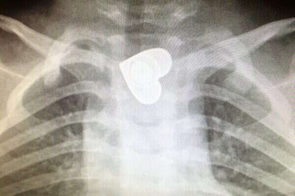 הילד נשלח לצילום שהראה כי הוא בלע כפתור בגודל של מטבע של חצי שקל וכי הכפתור נשאר בחלק התחתון של הוושט. גם הרופאים שכבר ראו הכל הופתעו לגלות בצילום את צורת הכפתור – לב.