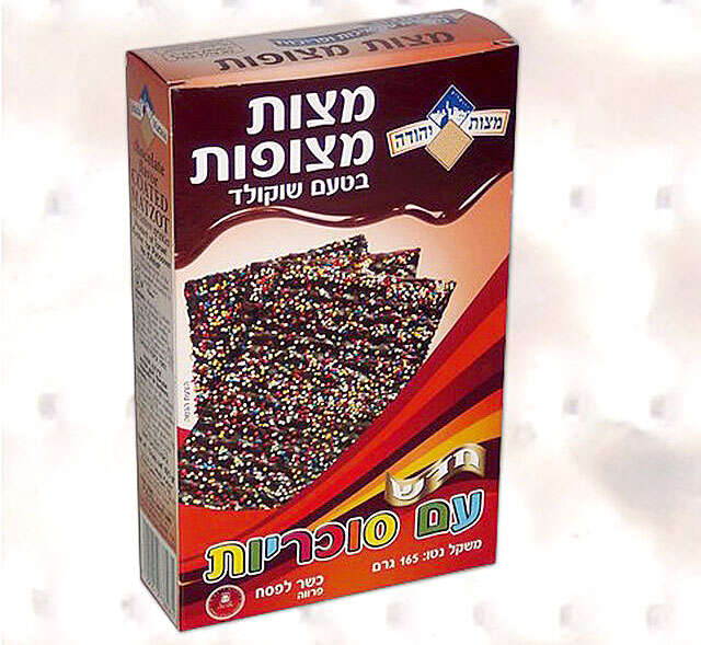 מצות מצופות בטעם שוקולד, מצות יהודה. כוללות סוכריות, קוקוס ופצפוצים. מחיר: 17-22 שקלים