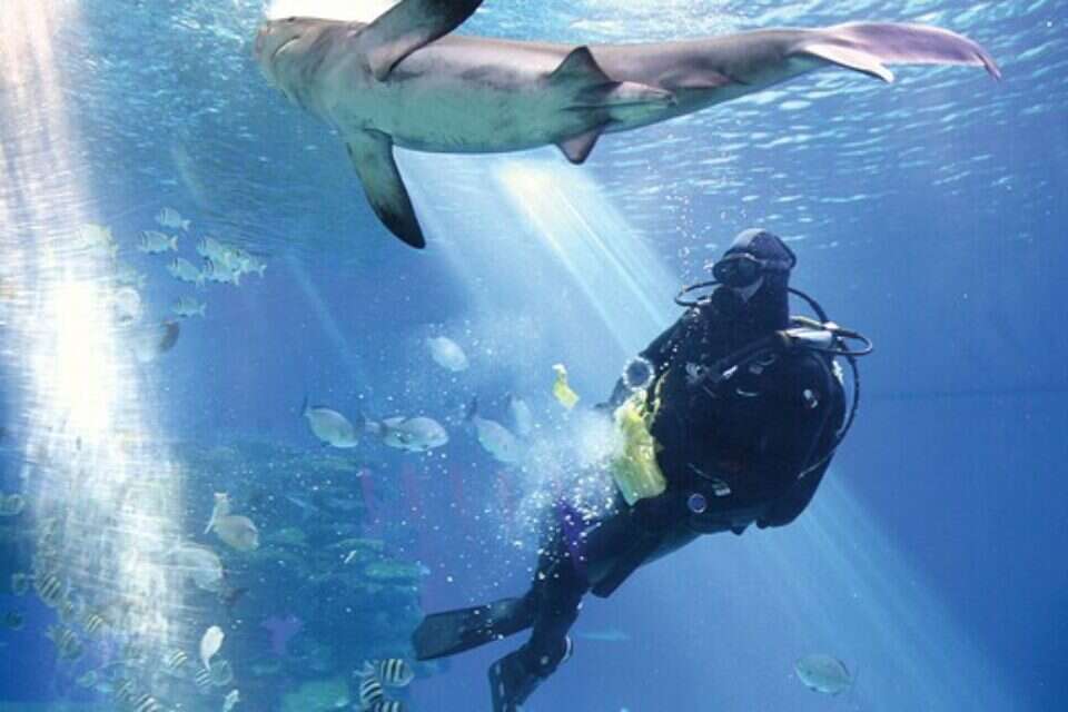 אל הבריכה עצמה כמובן שלא תוכלו להיכנס, אבל אפשר לחצות אותה באמצעות מנהרה שקופה שאורכה 15 מטרים, כשהכרישים ובעלי החיים הימיים שוחים מעל ולצידי המבקרים, ממש במרחק נגיעה.