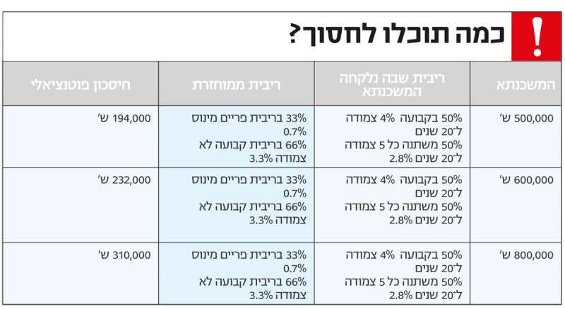 המשכנתא הראשונית שלקחה לפני כשנה וחצי היתה בריבית של כ־4.1%. המשכנתא החדשה עומדת על ריבית של כ־3.3%. למרות תשלום "קנס", כלומר עמלת היוון, בסך של כ־11 אלף שקלים, וגם פתיחת תיק הלוואה בסך של כ־2,000 שקלים, משום שהיא נטלה משכנתא חדשה, עדיין מדובר בחיסכון גדול.