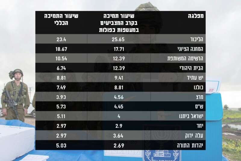 למה הצביעו החיילים? מספירת הקולות במעטפות הכפולות, הכוללות את החיילים, האסירים והחולים בבתי החולים, עולה כי מפלגת הליכוד זוכה לשיעור תמיכה של 25.65%, זאת לעומת 23.4% באוכלוסייה הכללית. למחנה הציוני בקרב החיילים תמיכה של 17.71%, לעומת 18.67%. הבית היהודי זוכה לתמיכה כפולה של החיילים, עם 12.39%, יהדות התורה זוכה לתמיכה מועטה, של חצי מהאוכלוסייה הכללית. ועלה ירוק? אם הייתם שואלים את חיילי צה"ל, הם היו עוברים אחוז החסימה.