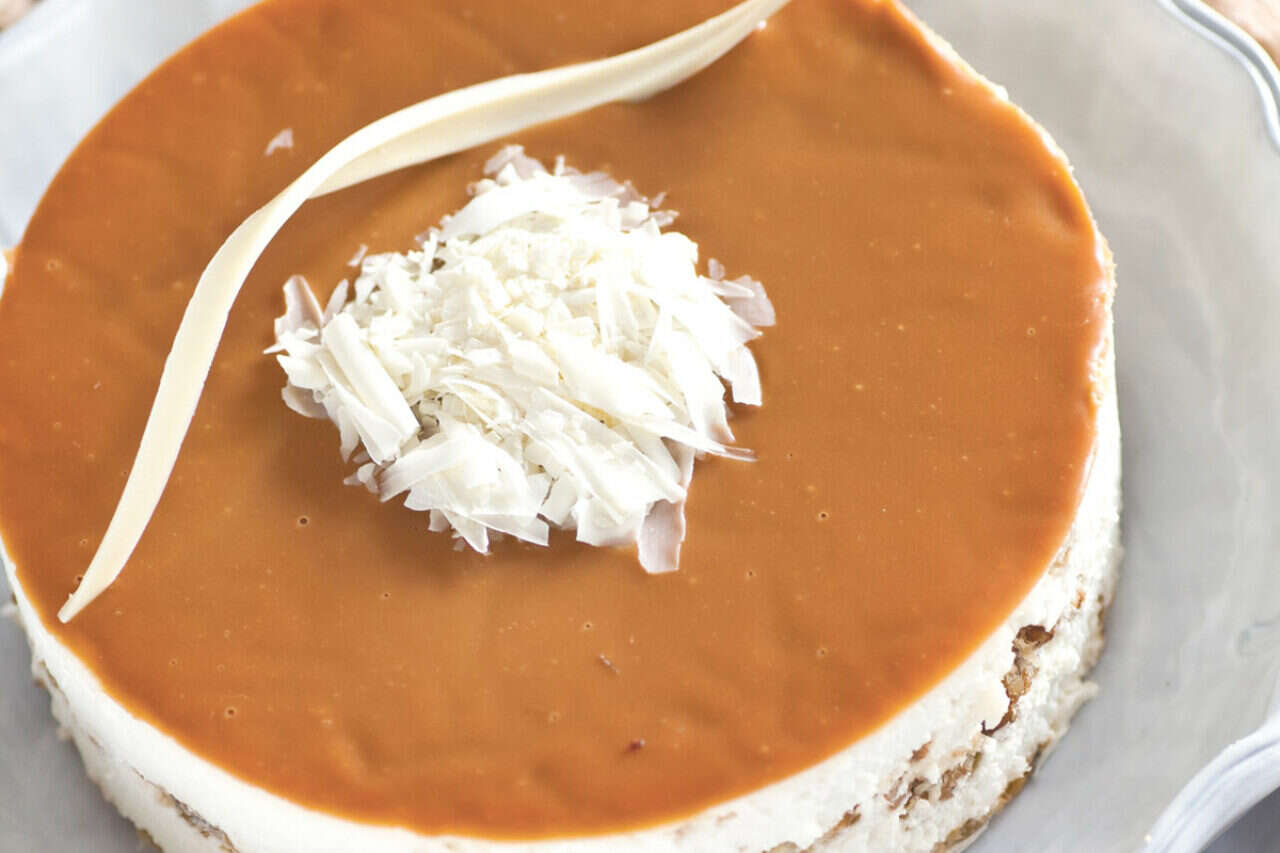מחממים את ריבת החלב והחלב לחום שפתיים. מערבבים לתערובת אחידה וחלקה ללא בועות אוויר. מוציאים את העוגה מהמקפיא, מחלצים מהתבנית ומקשטים בשכבת ריבת חלב דקה. אפשר גם לעטר בשוקולד לבן מגורד.