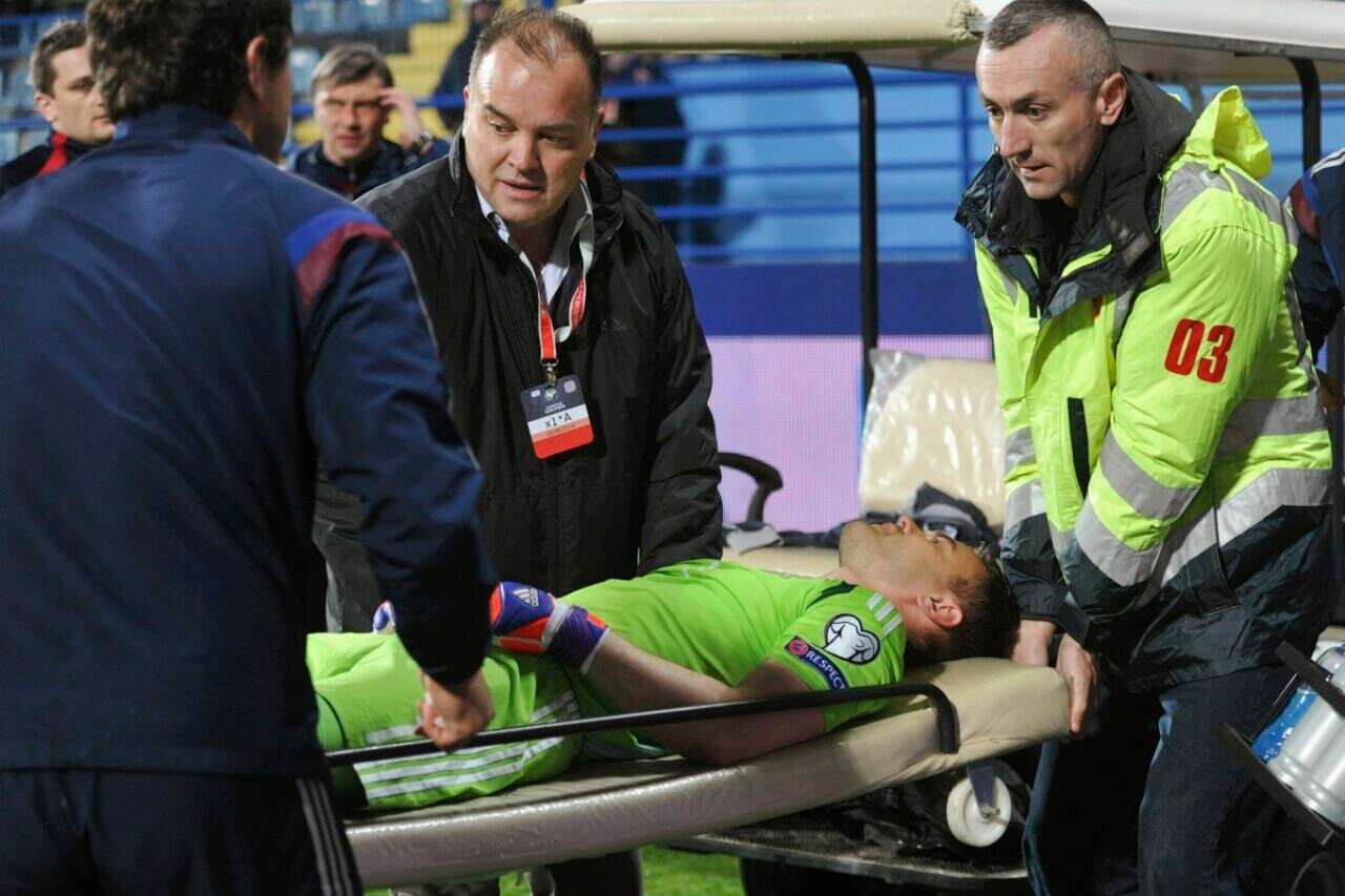 הבלאגן הגדול התחיל כבר אחרי 20 שניות. חזיז שנזרק מיציע אוהדי מונטנגרו פגע בראשו של שוער רוסיה איגור אקינפייב שהתמוטט על הדשא. "לא ראיתי את האירוע הזה כשהוא קרה" משחזר מאמן האורחים פאביו קאפלו; "רק אחר כך בצילומי הטלוויזיה הבנתי למה השוער שלי נלקח לבית החולים עם כוויות בצוואר".