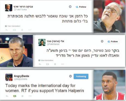 ואם ברוב המקרים החשבונות הפיקטיביים נפתחים אחרי שלמושא החשבון יש חשבון מקורי משלו, במקרה של החשבון הפיקטיבי של העיתונאי אלי סהר (FakeSarusi@), הזיוף קדם למקור. "פתחתי את החשבון שלי בגללו", מודה סהר (האמיתי), שלוקח את החיקוי כמחמאה, "הוא עשה לי צרות, אפילו אורי אלון חסם אותו. מי שזה לא יהיה, מדובר במישהו שמכיר אותי היטב ומבין גדול בכדורסל".