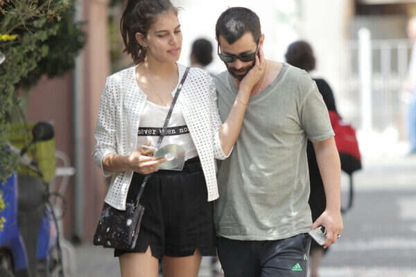 ההורים הטריים יובל שרף ושלומי שבן יצאו עם התינוק נורי לבית קפה במרכז תל אביב, וכמובן מיהרו להשוויץ בגוזל ששכב בעגלה // צילום: ניר פקין