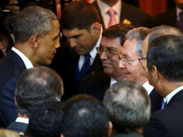 לאחר ציפייה מתמשכת נפגשו פנים אל פנים הנשיא אובאמה עם נשיא קובה ראול קסטרו. השניים לחצו ידיים ושוחחו בקצרה.