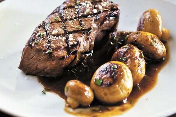 מחממים מחבת פסים כבדה עד שהיא לוהטת. מניחים שתי סינטות בכל פעם, הופכים, ממליחים ומפלפלים וצולים למידה הרצויה. במחבת נפרדת מטגנים את הפטריות בשמן זית עד שהן משחימות קלות. מוסיפים את ציר הבקר, הבירה והסוכר. מבשלים 5 דקות עד שהנוזל מצטמצם ומסמיך לרוטב. מוסיפים את המחמאה עד שהרוטב הופך לחלק. מניחים סינטה בכל צלחת ומפזרים עלי תימין ומלח גס. מחלקים את הפטריות בצורה שווה, מוסיפים עירית לרוטב ויוצקים על הבשר והפטריות. אפשר גם את לפרוס את הסינטה, לסדר כמניפה ולצקת את הרוטב מעל.