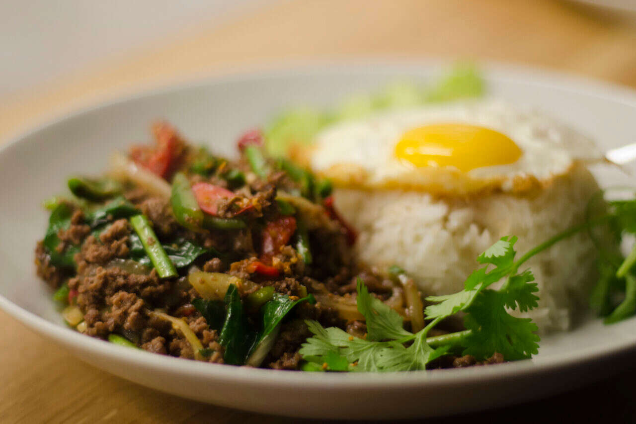3. מטגנים ביצת עין, מגישים את התבשיל לצד אורז מאודה ובליווי הביצה.