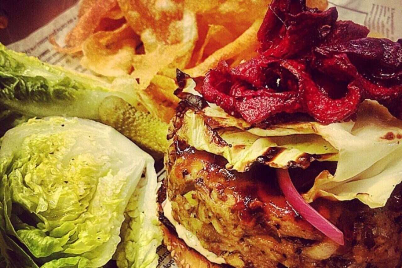 לחמניית בורגר, איולי ציפוטלה, בצלים בגריל, סלק במדורה, חמוצים, חסה ותפוציפס מעושן