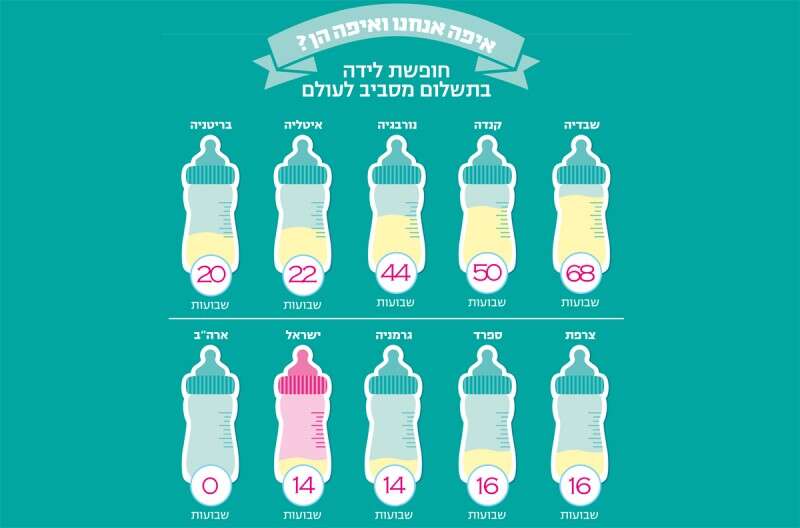 חופשת הלידה המותרת על פי החוק בישראל עומדת על 26 שבועות, 14 מתוכם בתשלום. בהשוואה לעולם, ישראל ממוקמת יחסית בתחתית מבחינת אורך חופשת הלידה בתשלום. בבריטניה, למשל, מאפשרים 20 שבועות של חופשה בתשלום, באיטליה 22 שבועות, בנורבגיה 44 שבועות ובשבדיה לא פחות מ־68 שבועות חופשה בתשלום מלא. מי שנמצאת בתחתית הרשימה היא ארה"ב, שבה לא מקבלת היולדת דבר. מדינות הקרובות לישראל הן הולנד, צרפת וספרד - אך גם שם מעניקים שבועיים יותר מליולדת הישראלית - 16 שבועות של חופשה בתשלום מלא.
