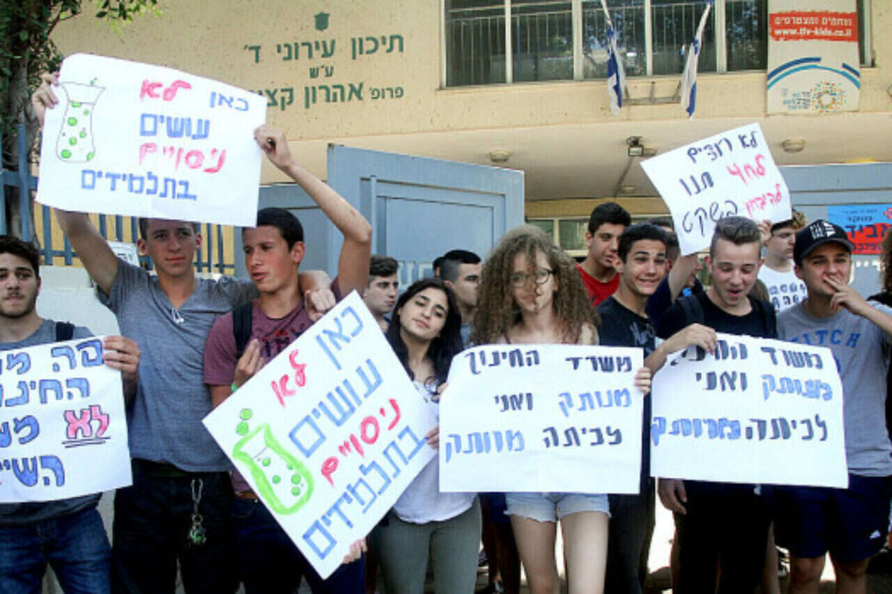 עשרות תלמידים, הורים, מורים ומנהלים הגיעו אמש להפגין מחוץ לתיכון עירוני ד' בתל אביב. בהפגנה, שהתקיימה בעת ניסוי שתוכנן לשעה 12:00, השתתפו תלמידי עירוני ט', עירוני י"א, עירוני י"ד, תיכון חדש, עירוני א' וביאליק־רוגוזין, והביעו את התנגדותם לנהלים המחייבים את התלמידים לשהות בכיתה 45 דקות לפני תחילת המבחן. יחד עם זאת, כל בית ספר מינה נציג שבדק את תקינות המערכת הממוחשבת שדרכה העביר משרד החינוך את התכנים. המפגינים החזיקו שלטים שעליהם נכתב "בית ספר זה לא כלא", "כאן לא עושים ניסויים בבני אדם" ועוד.