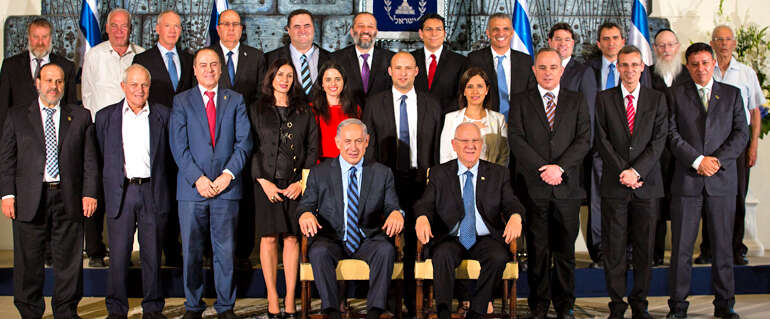 רגע של נחת: אחרי שבועות של משא ומתן, ולילות בלי שינה, היום בבית הנשיא בירושלים, 20 שרי הממשלה ה-34 נשמו לרווחה. השרים הסתדרו בשתי שורות. שלוש הנשים – מירי רגב, איילת שקד וגילה גמליאל, ניצבו בשורה הראשונה, ליד ראש הממשלה בנימין נתניהו והנשיא ראובן ריבלין, השניים היחידים שישבו על כיסא מרופד. איש מהנוכחים לא הסתיר את התרגשותו. המשתתפים חייכו למצלמה של אבי חיון, צלם לשכת העיתונות הממשלתית, והתמונה הקבוצתית המסורתית בוצעה בהצלחה. בסמוך עמדו יועצי השרים ששלפו את הטלפונים הניידים שלהם וצילמו "סלפי" כשמאחור הזרוע המבצעת של ישראל. הנשיא, ראש הממשלה והשרים השיקו כוסות יין באמירת "לחיים" והנשיא ריבלין הכריז: "לחיי ממשלת ישראל, לחיי מדינת ישראל"!
