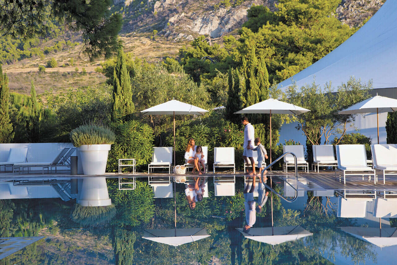 הגענו לגרגולימנו (Gregolimano) אחרי שעתיים נסיעה משדה התעופה של אתונה, ועוד חצי שעת הפלגה במעבורת. רק כשהמעבורת מתקרבת לחוף, מבחינים במבנה לבן שנחבא בין חורשת עצים עבותה שצמודה לרצועת החוף הזהובה, המקושטת בסירות קטנות, במיטות שיזוף ובשמשיות.