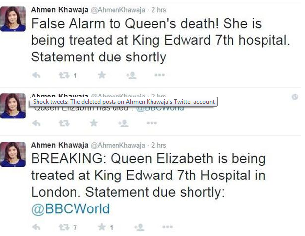 המבוכה החלה כאשר כתבת BBC בשפת האורדו (השפה המדוברת בפקיסטן) צייצה באנגלית ציוץ שבו היה כתוב: "מבזק: המלכה אליזבת' מטופלת בבית החולים 'המלך אדווארד השביעי' בלונדון. הודעה תימסר בקרוב". זמן קצר לאחר מכן אותה כתבת, אמין קווג'ה, צייצה בקצרה: "המלכה אליזבת' מתה". ציוץ זה הקפיץ את התקשורת הבריטית והעולמית, כולל את רשת CNN, העיתון הגרמני "בילד" והעורך של העיתון ההודי "הינדוסטן טיימס".