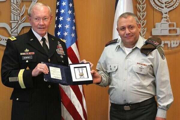 בביקורו החמישי והאחרון כיו"ר המטות המשולבים של צבא ארה"ב בישראל, התקבל אתמול הגנרל מרטין דמפסי בבסיס הקריה בת"א במשמר כבוד של חיילי צה"ל. הרמטכ"ל, רא"ל גדי איזנקוט, העניק לגנרל דמפסי אות הערכה ושוחח עימו על האתגרים הביטחוניים בזירה.