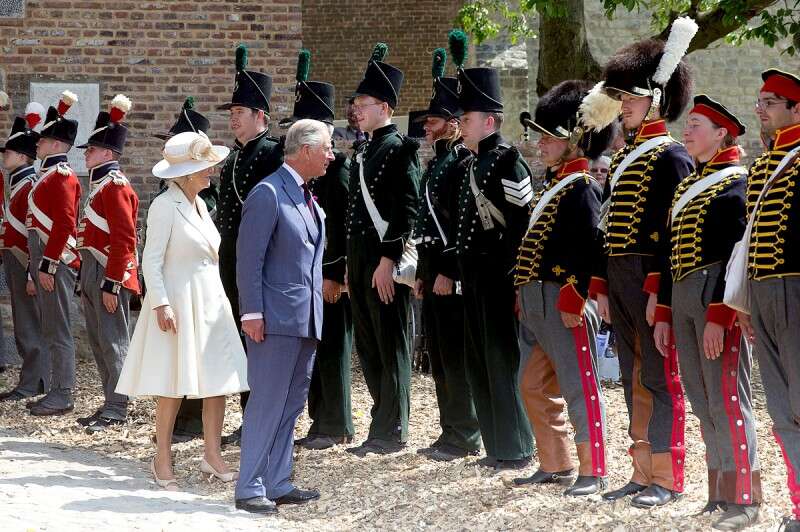 חוות הגבורה. הנסיך צ'ארלס ורעייתו משוחחים עם שחקנים שמשתתפים בשחזור הקרב ליד חוות הוגמון, מהמוקדים של קרב ווטרלו // צילום: GettyImages