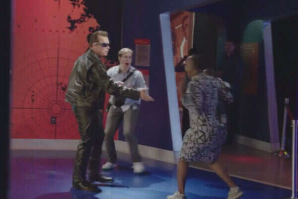 בסרטון ניתן לראות חבורה של אנשים שמגיעה להצטלם עם הטרמינייטור, ובזמן שהם מתוכננים לפריים המושלם, שוורצנגר "מתעורר לחיים" ומקפיץ אותם מרוב פחד.